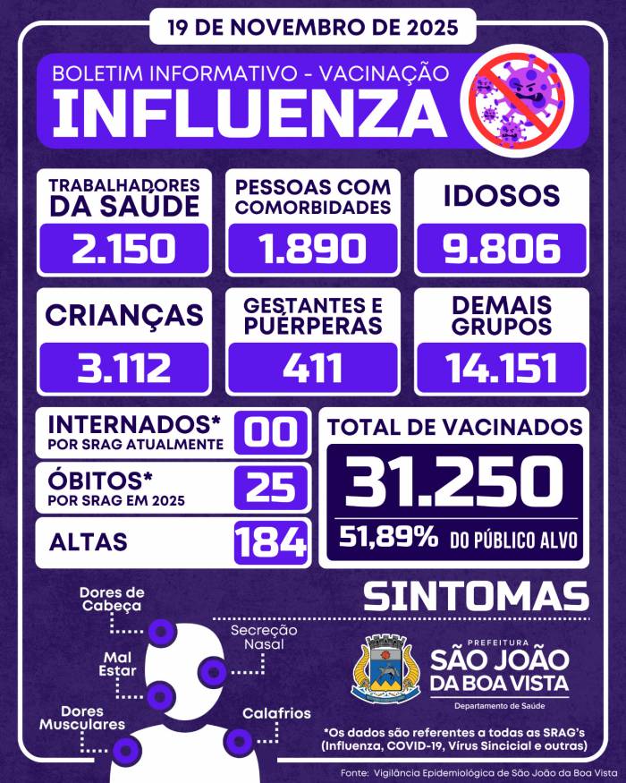 A Prefeitura de São João da Boa Vista, por meio do Departamento de Saúde, divulgou nesta quarta-feira (19 de novembro de 2025) o novo boletim da campanha de vacinação contra a Influenza. Embora 31.250 pessoas já tenham sido imunizadas, o número representa apenas 51,89% do público-alvo, índice considerado baixo pelas autoridades sanitárias.