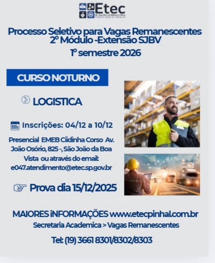 Inscrições abertas Etec SJBV! Curso Logística NOTURNO (2º Módulo) para 1º semestre de 2026. Prova dia 15/12/2025.