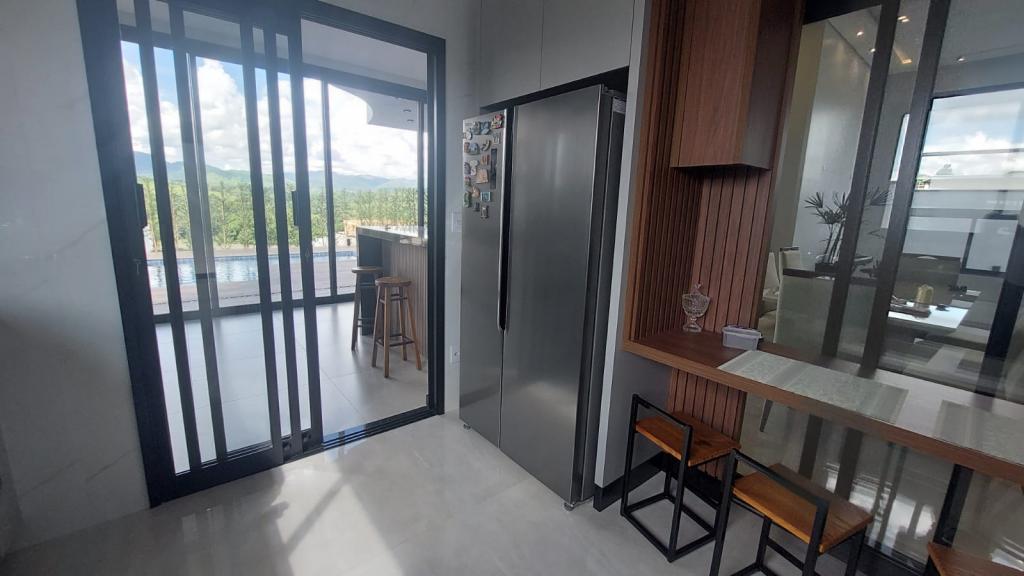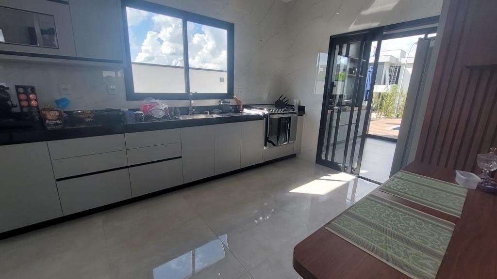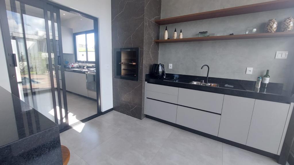 Casa térrea com 4 suítes, sendo 1 máster (possibilidade de banheira de canto) com closet, 2 júnior com walk in closet e 1 auxiliar com espaço para armário embutido e porta balcão. Home Theater, sala de estar e jantar, lavabo, cozinha, despensa e área de serviço, banheiro de apoio, área gourmet com churrasqueira e banheiro externo, piscina e energia fotovoltaica.