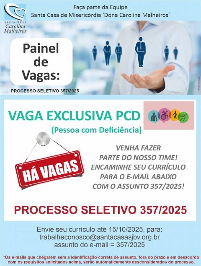 Há vagas exclusivas para Pessoa com Deficiência (PCD) na Santa Casa de Misericórdia Dona Carolina Malheiros. Interessados em participar do processo seletivo 357/2025 devem enviar currículo para o e-mail: trabalheconosco@santacasasjbv.org.br, até 15 de outubro.
