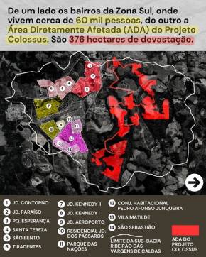 No Projeto Colossus, da Viridis Mining, os impactos sobre áreas urbanas são igualmente preocupantes. As cavas previstas ficam a menos de 1 km de bairros densamente habitados da zona sul de Poços de Caldas, onde vivem cerca de 60 mil pessoas. A proximidade com escolas, hospitais, postos de saúde e outros equipamentos públicos, expõe a população a poeira, ruído e vibrações de maquinário pesado, num local em que as residências não estão preparadas para esse tipo de impacto. O EIA/RIMA não apresenta uma modelagem adequada de dispersão de particulados contaminantes na atmosfera, e ignora  o quadro crônico de falta de água na região.