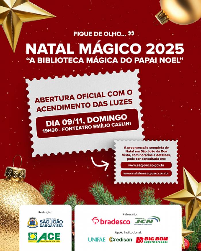 compartinharenviar informaçõesenviar foto comentarA magia do Natal começa a tomar conta de São João da Boa Vista. A Prefeitura, por meio do Departamento de Cultura e Turismo, em parceria com a ACE Associação Comercial e Empresarial, preparou uma programação especial e cheia de atrações para celebrar esse período festivo. O Natal Mágico 2025 transforma a cidade em um cenário de encanto, com música, teatro, gastronomia, luzes e, claro, muita emoção.