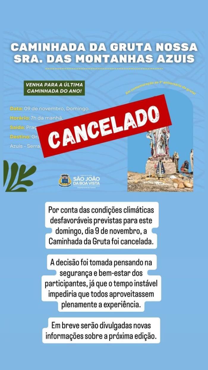 Caminhada da Gruta Nossa Senhora das Montanhas Azuis foi cancelada