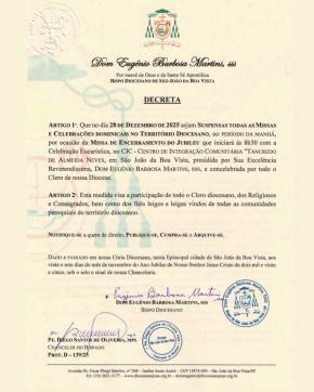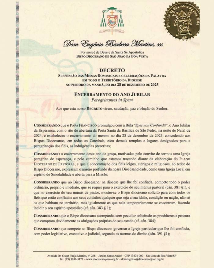 A Diocese de São João da Boa Vista publicou, na quinta-feira, 27 de novembro, o decreto oficial assinado por Dom Eugênio Barbosa Martins, sss, Bispo Diocesano, determinando a suspensão de todas as Missas e Celebrações Dominicais realizadas no período da manhã, em todas as paróquias e comunidades do território diocesano, no dia 28 de dezembro de 2025.