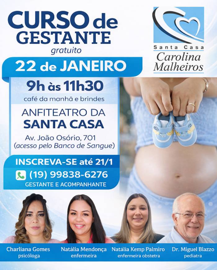 compartinharenviar informaçõesenviar foto comentarNo próximo dia 22 de janeiro, a Santa Casa de Misericórdia Dona Carolina Malheiros realizará a primeira edição do ano do curso de gestante. O evento é gratuito e está programado para ocorrer das 9h às 11h30, no anfiteatro do hospital de São João da Boa Vista.