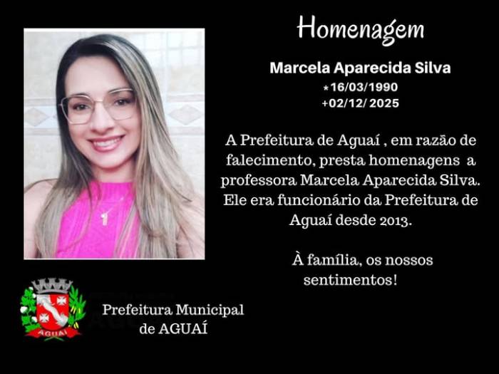 A Prefeitura Municipal de Aguaí divulgou uma nota de pesar pelo falecimento da professora Marcela Aparecida Silva, ocorrido em 2 de dezembro de 2025. Nascida em 16 de março de 1990, Marcela integrava o quadro de servidores do município desde 2013, atuando na área da educação.
