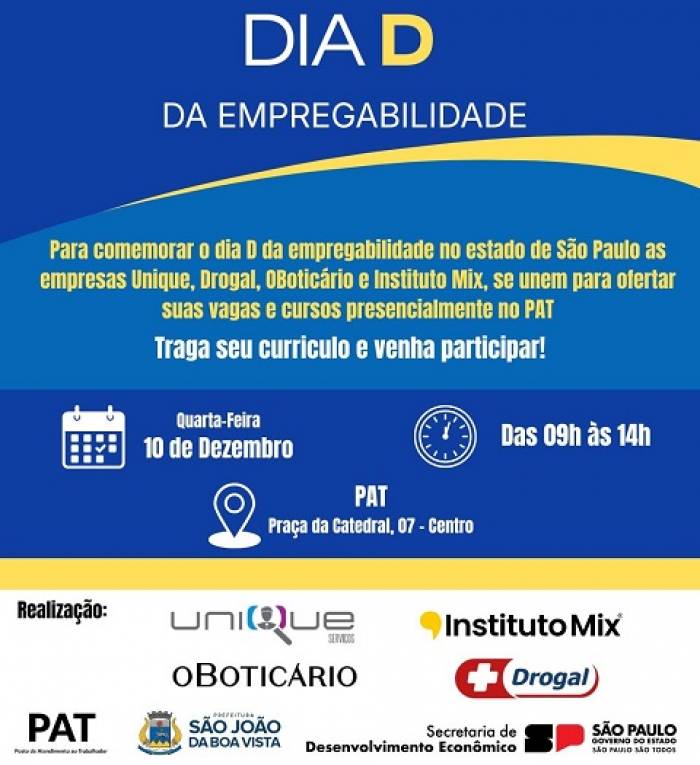 A Prefeitura de São João, por meio do Departamento de Desenvolvimento Econômico, convida para participar do Dia D da Empregabilidade, no dia 10 de dezembro, das 9h às 14h, no PAT Posto de Atendimento ao Trabalhador (Praça da Catedral, nº 7  Centro).