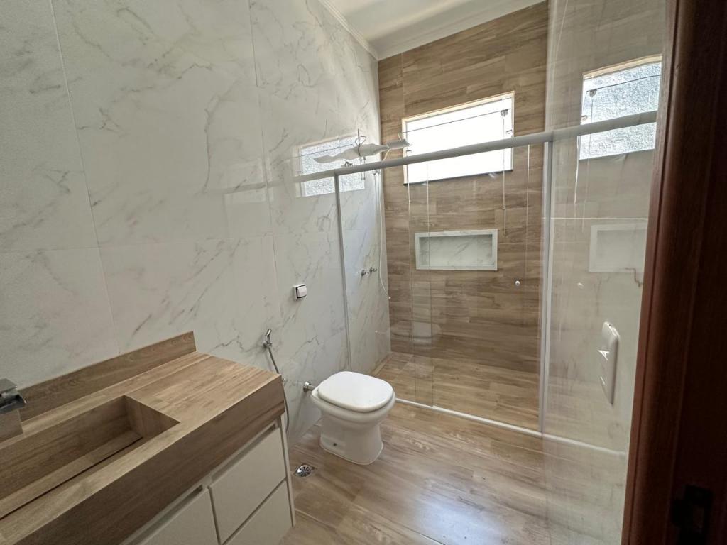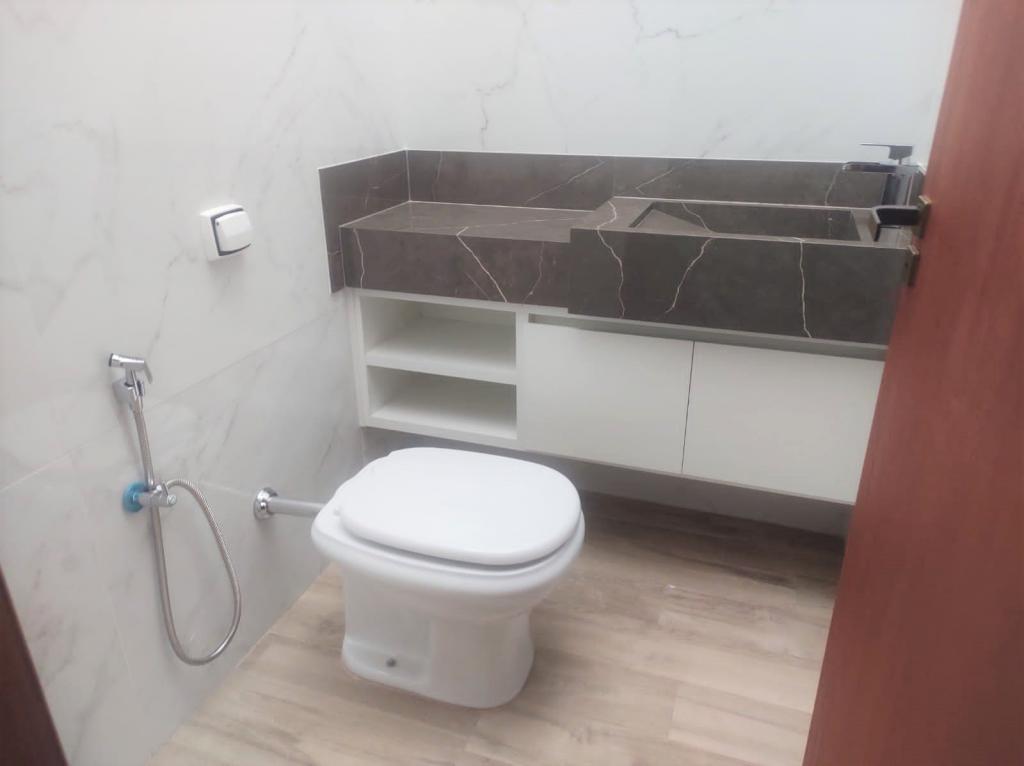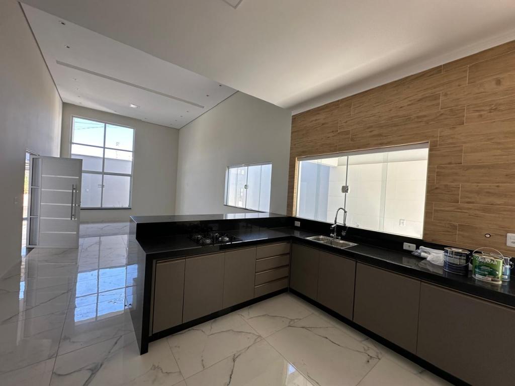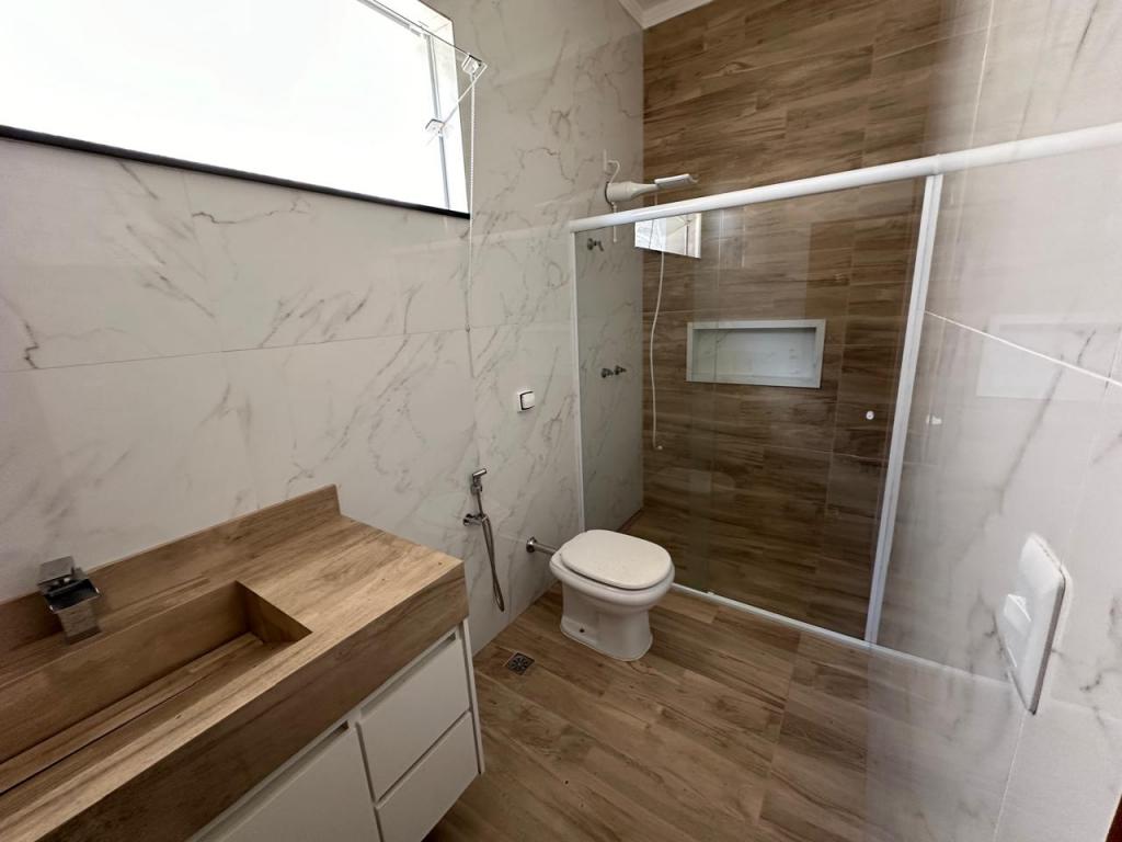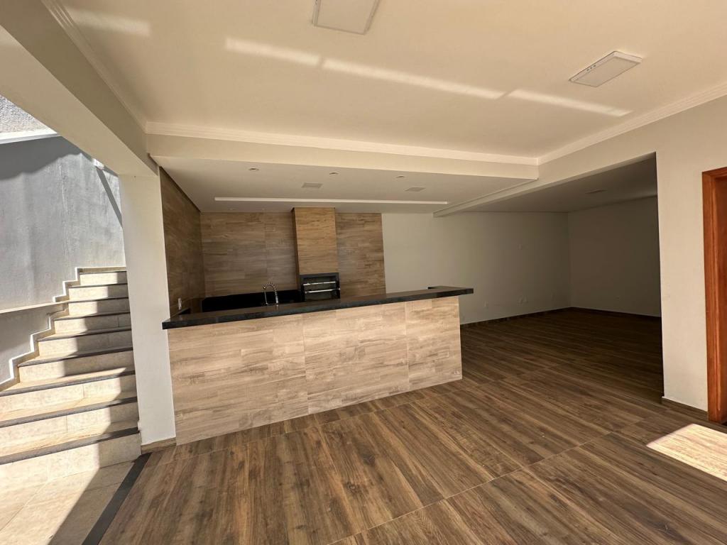 Casa nova com 3 suítes com armários, sala com pé direito duplo, lavabo, 5 banheiros e área gourmet com salão. Aceita imóvel como parte do pagamento, de preferência comercial.