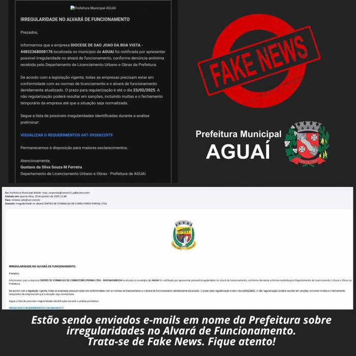 Estão sendo enviados e-mails em nome da Prefeitura de Aguaí sobre irregularidades no Alvará de funcionamento. Trata-se de Fake News! Fique atento!!!