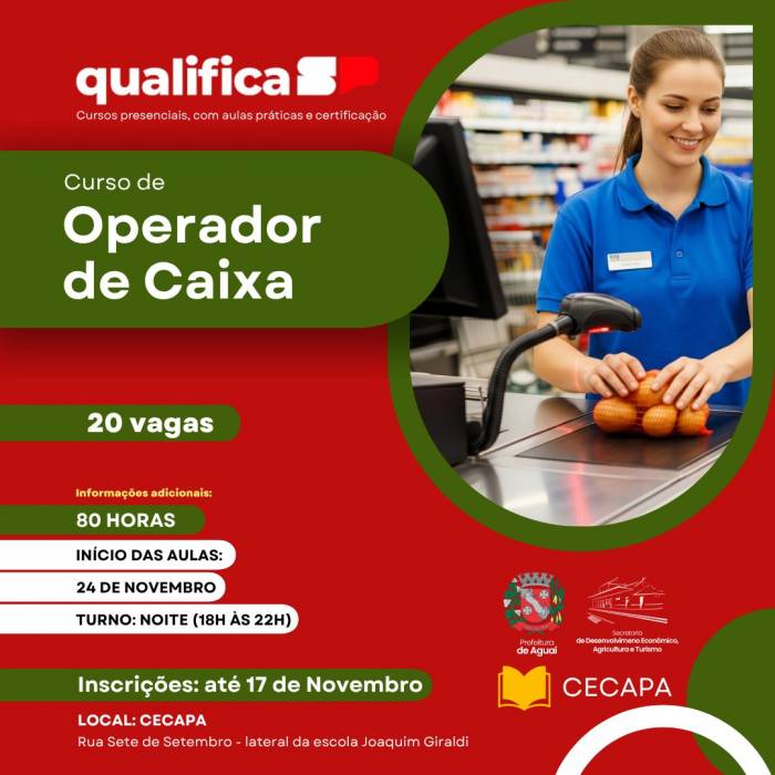 Curso de Operador de Caixa em Aguaí está disponível para inscrições