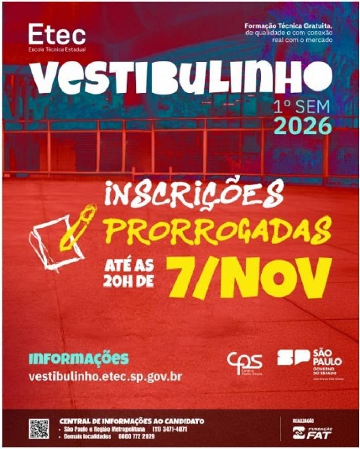 As inscrições devem ser feitas pelo site vestibulinho.etec.sp.gov.br. A taxa de inscrição é de R$29 e a prova acontece no dia 30 de novembro. A formação é gratuita e presencial.
