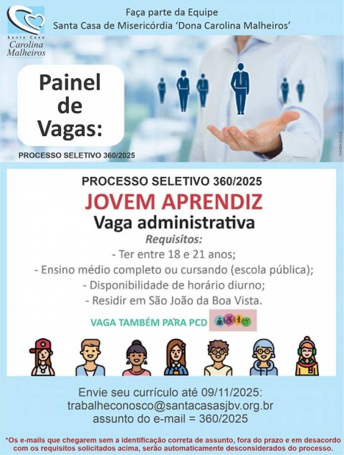 Há vaga na Santa Casa de Misericórdia Dona Carolina Malheiros para Jovem Aprendiz atuar na área administrativa. Interessados em participar do processo seletivo 360/2025 devem enviar currículo para o e-mail: trabalheconosco@santacasasjbv.org.br, até 9 de novembro.