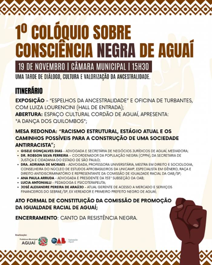 A Prefeitura e a OAB Aguaí, farão no próximo dia 19/11, o 1º Colóquio sobre Consciência Negra. O evento acontecerá na Câmara Municipal, a partir das 15h30, e contará com uma ampla programação.