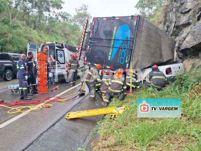 Um acidente envolvendo um caminhão de pequeno porte e uma VW Saveiro deixou um motorista ferido na tarde desta terça-feira (18), por volta das 15h, na Rodovia Lourival Lindório de Faria (SP-344), trecho entre Vargem Grande do Sul e São Sebastião da Grama. Segundo informações da TV Vargem, o caminhão seguia sentido Grama/Vargem e, na altura do km 245, o condutor perdeu o controle da direção, rodou na pista e colidiu com a Saveiro. Após o impacto, o caminhão tombou sobre o carro e ficou imobilizado entre o acostamento e uma área de mata. O motorista do caminhão, um jovem de 20 anos, morador de Guarulhos, transportava uma carga de leite condensado para São João da Boa Vista. Na Saveiro estavam dois ocupantes. O motorista, de 60 anos, sofreu suspeita de fratura no braço esquerdo. O passageiro, de 42, não se feriu. Ambos ficaram presos nas ferragens. Equipes do SAMU, da Guarda Civil Municipal e do Corpo de Bombeiros atuaram no resgate. As vítimas do carro foram desencarceradas e levadas ao Hospital de Caridade. A GCM fez a primeira sinalização do trânsito até a chegada do DER, que assumiu o controle da via. O Policiamento Rodoviário registrou a ocorrência os testes do etilômetro deram negativo para os dois motoristas. A remoção dos veículos deverá ser realizada por um guincho especializado.